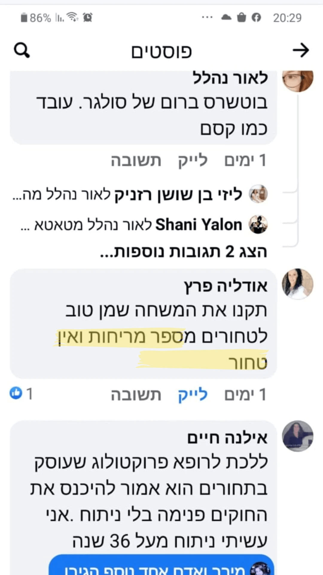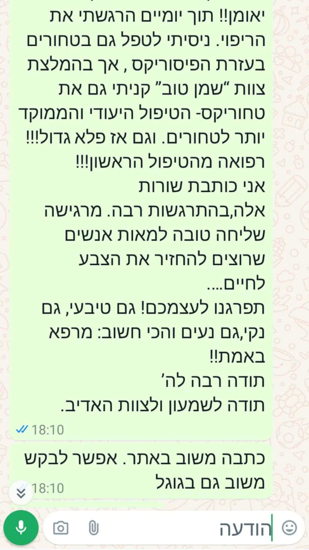 הייתי חייבת להתוודות ולהודות לך מקרב לב על כך שהצלת אותי מניתוח פיסורה. למען האמת בתחילה כשדיברנו לא האמנתי שזה יכול לעבוד. השילוב של המשחה והשמן אורגנו פשוט הצילו אותי תרתיי משמע. רציתי שכולם יידעו וייזכו להיעזר בך. שוב תודה רבה תבורך!