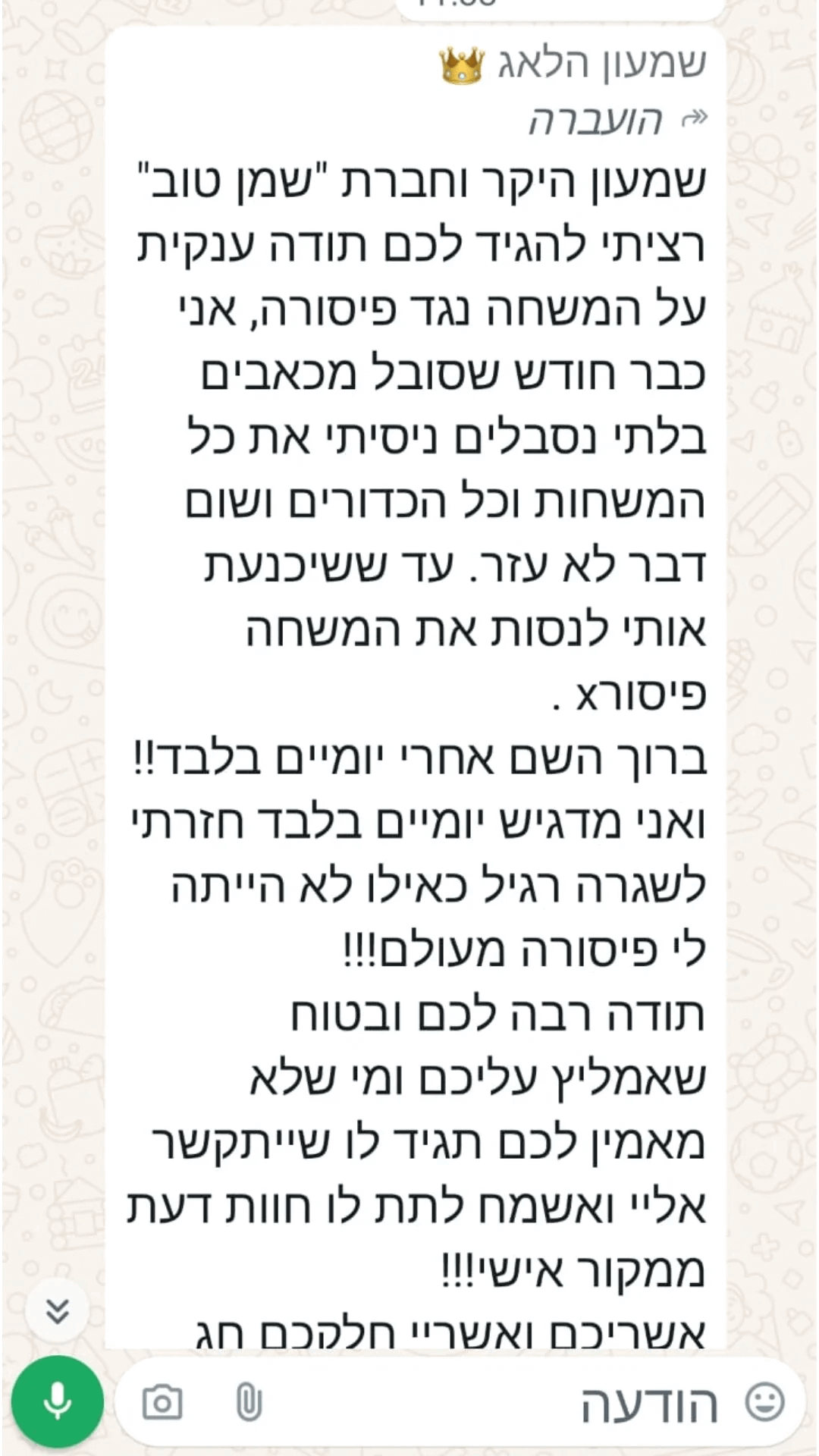 פניתי שוב לאינטרנט לחפש מזור לצרה הצרורה הגעתי לאתר שלך ולשם גילוי נאות אומר שאני לא מאמין בדברים טבעוניים ולא תכננתי לרכוש את המשחה.צלצלתי אלייך בכל זאת על מנת להתעניין, הקול שלך כבש אותי ולאחר שיחה של 2-3 דק’ החלטתי לנסות אמרתי לעצמי כל כך הרבה כסף כבר הוצאתי מה זה עוד 300 ש״ח. רכשתי את המשחה ממך ולבקשתי המשחה הייתה אצלי תוך 26 שעות מרגע ההזמנה שאפו קודם כל על השירות ביקשתי מהר קיבלתי מהר.